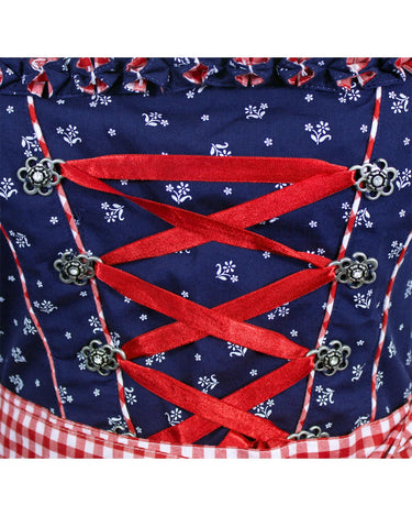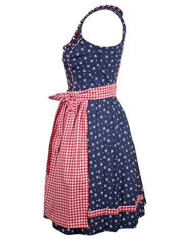 Das schöne Dirndlkleid besteht aus einem blauen Baumwollstoff, welcher mit vielen kleinen weißen Blumen bedruckt ist und einer Rot Weiß karierten Schürze. Süße Froschmaulrüschen im Muster des Kleides zieren den Ausschnitt und betonen somit das Dekolleté. Das Minidirndl wird an der linken Seite unterhalb des Armes durch einen Reißverschluss geschlossen. Zum Betonen des Dekolleté kann vorne noch ein rotes Satinband geschnürt werden. Dieses wird durch Ösen in Blumenform mit Strass Elementen gehalten.