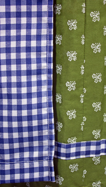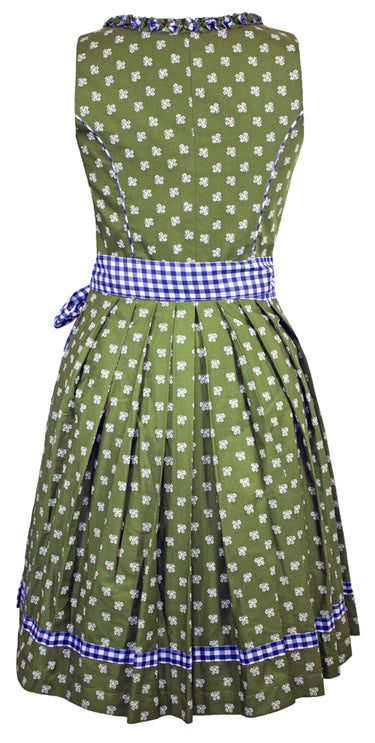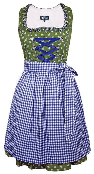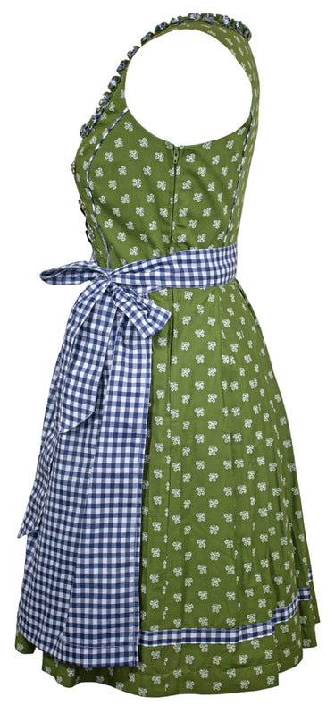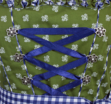 Das schöne Dirndlkleid besteht aus einem grünen Baumwollstoff, welcher mit vielen kleinen weißen Blumen bedruckt ist und einer Blau Weiß karierten Schürze. Süße Froschmaulrüschen im Muster des Kleides zieren den Ausschnitt und betonen somit das Dekolleté. Das Minidirndl wird an der linken Seite unterhalb des Armes durch einen Reißverschluss geschlossen. Zum Betonen des Dekolleté kann vorne noch ein dunkelblaues Satinband geschnürt werden. Dieses wird durch Ösen in Blumenform mit Strass Elementen gehalten.