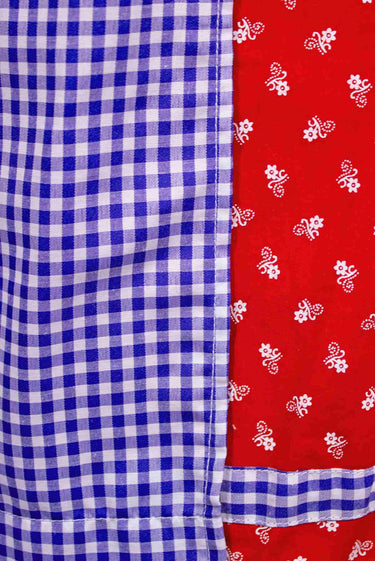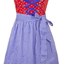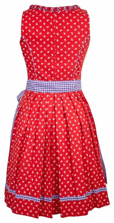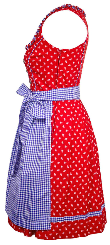 Das schöne Dirndlkleid besteht aus einem roten Baumwollstoff, welcher mit vielen kleinen weißen Blumen bedruckt ist und einer Blau Weiß karierten Schürze. Süße Froschmaulrüschen im Muster des Kleides zieren den Ausschnitt und betonen somit das Dekolleté. Das Minidirndl wird an der linken Seite unterhalb des Armes durch einen Reißverschluss geschlossen. Zum Betonen des Dekolleté kann vorne noch ein dunkelblaues Satinband geschnürt werden. Dieses wird durch Ösen in Blumenform mit Strass Elementen gehalten.