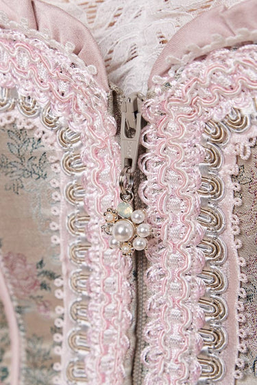 Das Dirndl Roxana zieht alle Blicke auf sich! Das zartschimmernde Ornamentenmuster trifft auf eine atemberaubende Spitzenschürze mit glänzenden Pailletten. Ein Kleider-Traum in Hellgrün mit rosa-farbenen Akzenten aus dem Haus Krüger, der Sie mit einem romantischen Look und der tollen Verarbeitung und Qualität mit Sicherheit überzeugt. Das zauberhafte Trachtenkleid ist aus einem hellgrünen Material mit zartem Muster gefertigt. Der tiefe Herzausschnitt wird mit einer Froschmaulrüsche und Borten besonders betont und Strass-besetzte Miederhaken zieren das Mieder. Geschlossen wird das Damendirndl vorn mit einem Reißverschluss, der von der Schnürung gekonnt verdeckt wird. Die wunderschöne Spitzenschürze mit floralem Muster rundet das Gesamtbild perfekt ab, Pailletten auf der Schürze setzen zusätzlich Akzente.
