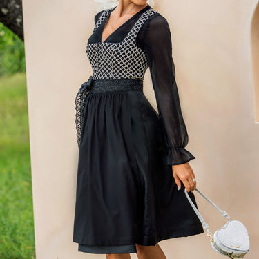 Das MarJo Dirndl „Ensdorf“ ist eine stilvolle Hommage an klassische Trachtenmode mit einem Hauch moderner Eleganz. In zeitlosem Schwarz gehalten, überzeugt dieses Modell durch sein geschmackvolles Design und seine feinen Details. Das Mieder zeigt sich mit einem dezenten Muster, das dem Oberteil Tiefe und Struktur verleiht, während der eckige Ausschnitt eine feminine und gleichzeitig selbstbewusste Silhouette formt. Die liebevoll gestalteten Knöpfe auf der Vorderseite unterstreichen die hochwertige Verarbeitung und setzen nostalgische Akzente.