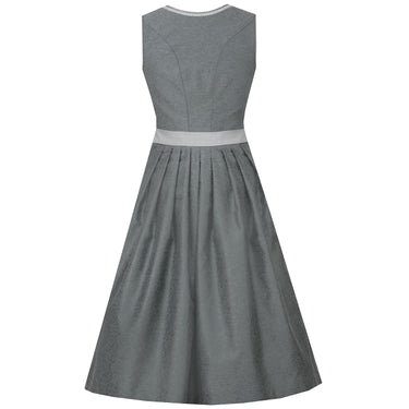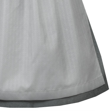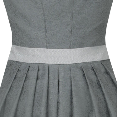 Die Schürze des Dirndls ist ein weiteres, raffiniertes Detail. Sie zeigt ein feines Fischgrät-Muster, das sich perfekt mit dem Jacquard-Stoff des Rocks ergänzt und eine harmonische Gesamtwirkung erzielt. Das verstärkte Schürzenband ist mit einer eleganten Metallschließe im Altsilber-Look versehen, die im Ornamentik-Ajour-Design gehalten ist und einen zusätzlichen Akzent setzt. Diese Schließe lässt sich zum Einhaken verwenden, was für eine praktische und gleichzeitig stilvolle Befestigung sorgt. Die Schürze ist am Bund gehanselt, was für einen besonders schönen Faltenwurf sorgt und dem Dirndl eine dynamische Optik verleiht. Der gerade Saum sorgt für einen klassischen Abschluss, der das elegante Design des Dirndls vervollständigt.