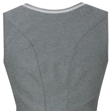 Ein besonderes Highlight dieses Dirndls ist der wunderschöne Balconette-Ausschnitt, der für ein verführerisches, aber dennoch stilvolles Dekolleté sorgt. Der Ausschnitt sowie die Ärmelausschnitte sind mit feiner Wellenborte und Schürzenstoff paspeliert, was dem Dirndl einen Hauch von Raffinesse verleiht und den eleganten Look unterstreicht. Der schimmernde Jacquard-Stoff, der für das Mieder und den Rock verwendet wurde, trägt ein florales Ornamentik-Muster, das dem Dirndl eine anmutige und zeitlose Eleganz verleiht.