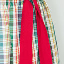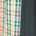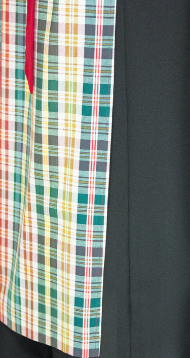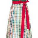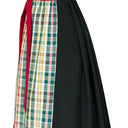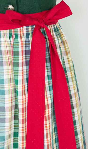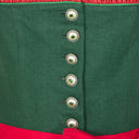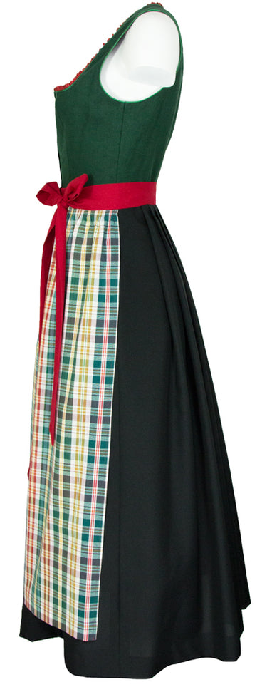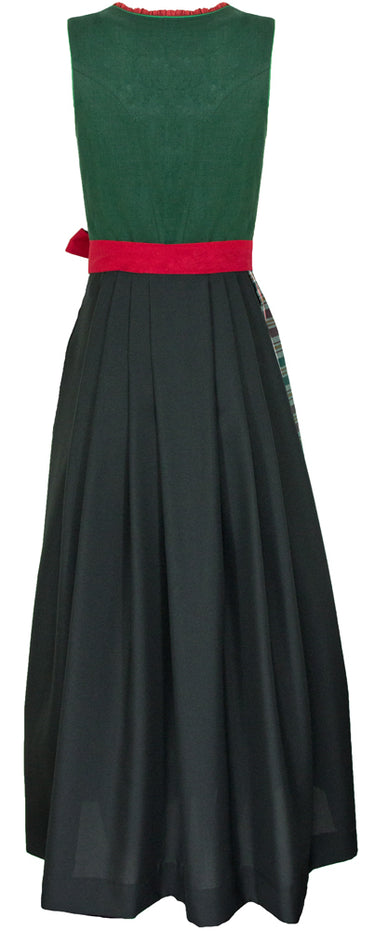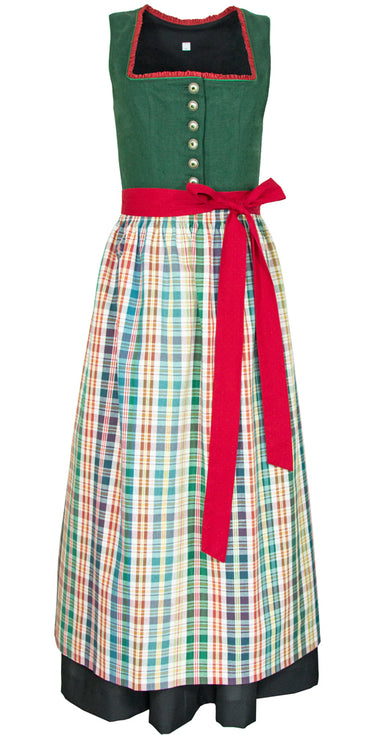 Das Oberteil des Dirndlkleids ist aus dunkelgrünem Leinen und der Ausschnitt wird von einer dezenten, roten Rüsche betont. Geschlossen wird das knöchellange Trachtenkleid im Landhausstil vorne mit silbernen Zierknöpfen mit grünen funkelnden Schmucksteinen. Der lange schwarze Rock ist aus Polyesterstoff und sehr angenehm zu tragen. Aufgelockert wird das Maxidirndl von einer rot, grün, gelb und weiß karierten Schürze mit einem roten Schürzenband.