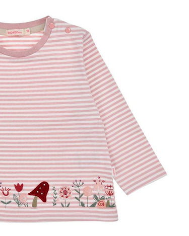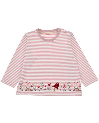 Dieses niedliche Langarm-Shirt von BoONDI Kidswear begeistert mit seinem rosa-weiß gestreiften Design und den liebevoll aufgestickten Motiven von Blume und Pilzen. Die Knöpfe auf der Schulter erleichtern das An- und Ausziehen, während die weiche Baumwolle für hohen Tragekomfort sorgt. Ein süßes und praktisches Lieblingsstück für jeden Tag!