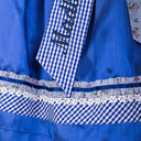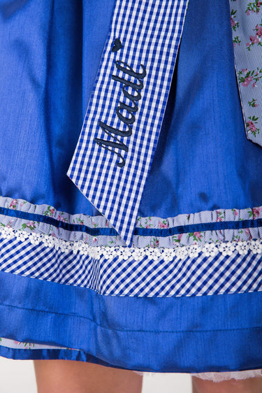 Das hübsche Dirndl hat ein florales Muster und ist am Rocksaum mit einer hübschen Borte versehen. Der optische Klappkragen spiegelt das Karo Muster des Schürzenbandes, welches mit der Aufschrift "Madl" bestickt ist, wieder und ist ein schönes Highlight. Die edel glänzende Schürze ist mit Rüschen und schöner Borte versehen. Das Dirndlkleid hat einen Reißverschluss und eine farblich passende Miederschnürung vorn.