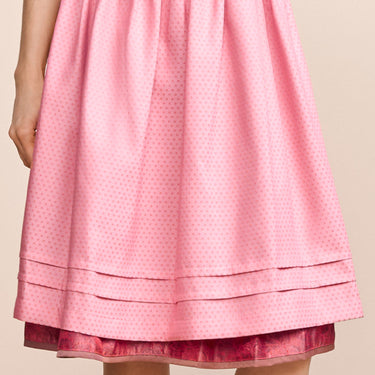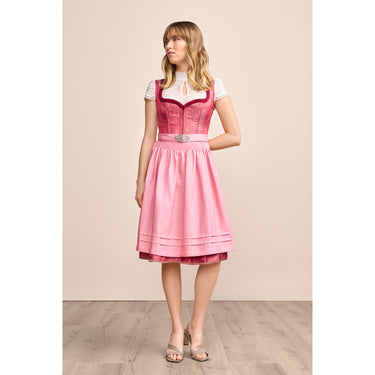 Eine weitere Besonderheit ist die Schürze, die das Dirndl Fynia perfekt abrundet. Sie ist mit einem feinen Streublumenmuster verziert, das nicht nur die Optik des Dirndls ergänzt, sondern dem gesamten Look eine zusätzliche verspielte und lebendige Note verleiht. Diese Schürze fügt sich harmonisch in das Design ein und trägt zur insgesamt zarten, frischen Ausstrahlung des Dirndls bei.