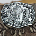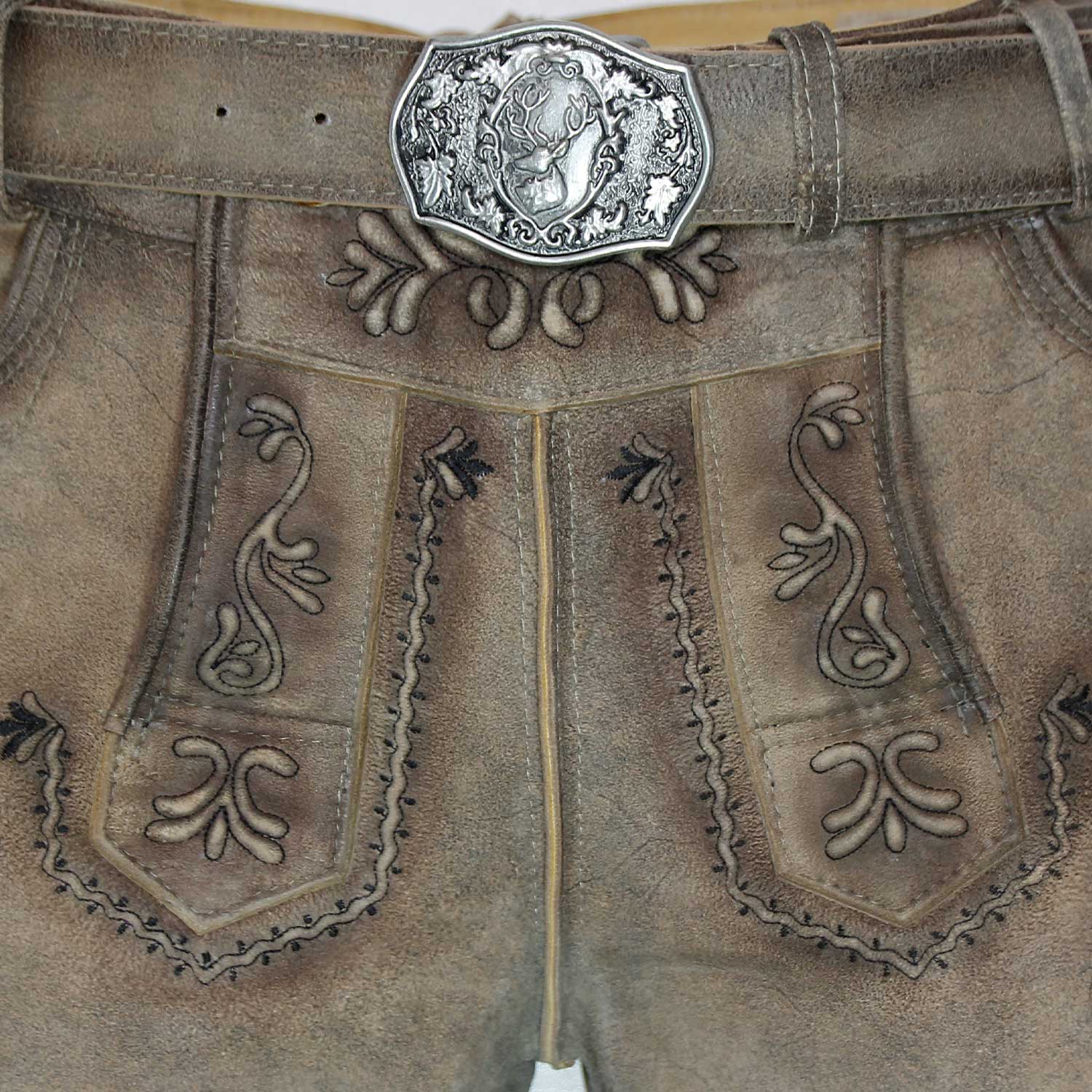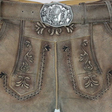 Ein besonderes Highlight ist der mitgelieferte Gürtel mit einer detailreich verzierten Metallschließe. Das Motiv zeigt eine traditionelle alpenländische Szene mit Hirsch und Eichenlaub, ein Symbol für Naturverbundenheit und Tradition. Die Gürtelschlaufen sind fest vernäht und bieten einen sicheren Halt, sodass der Gürtel perfekt sitzt und die Lederhose optimal ergänzt.