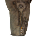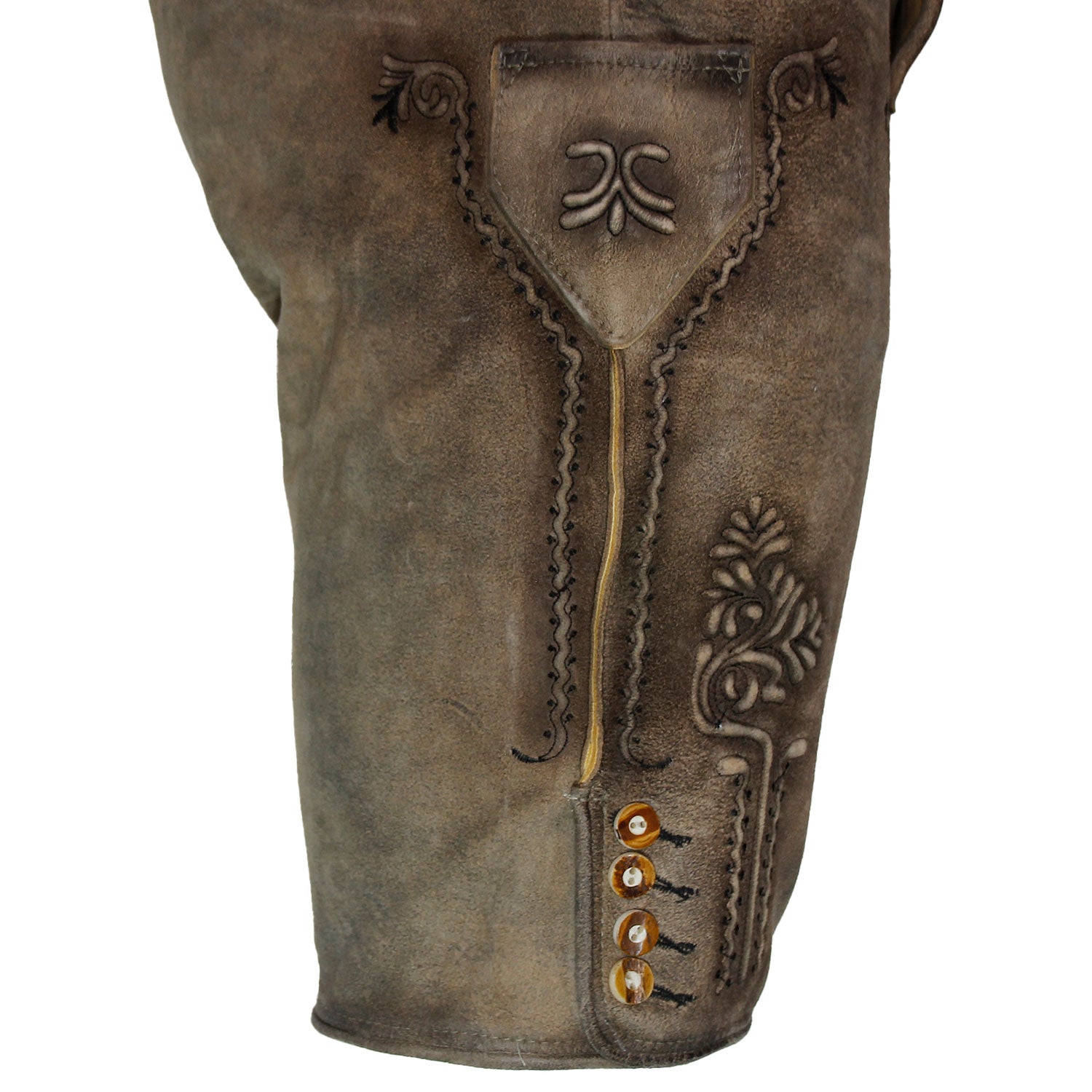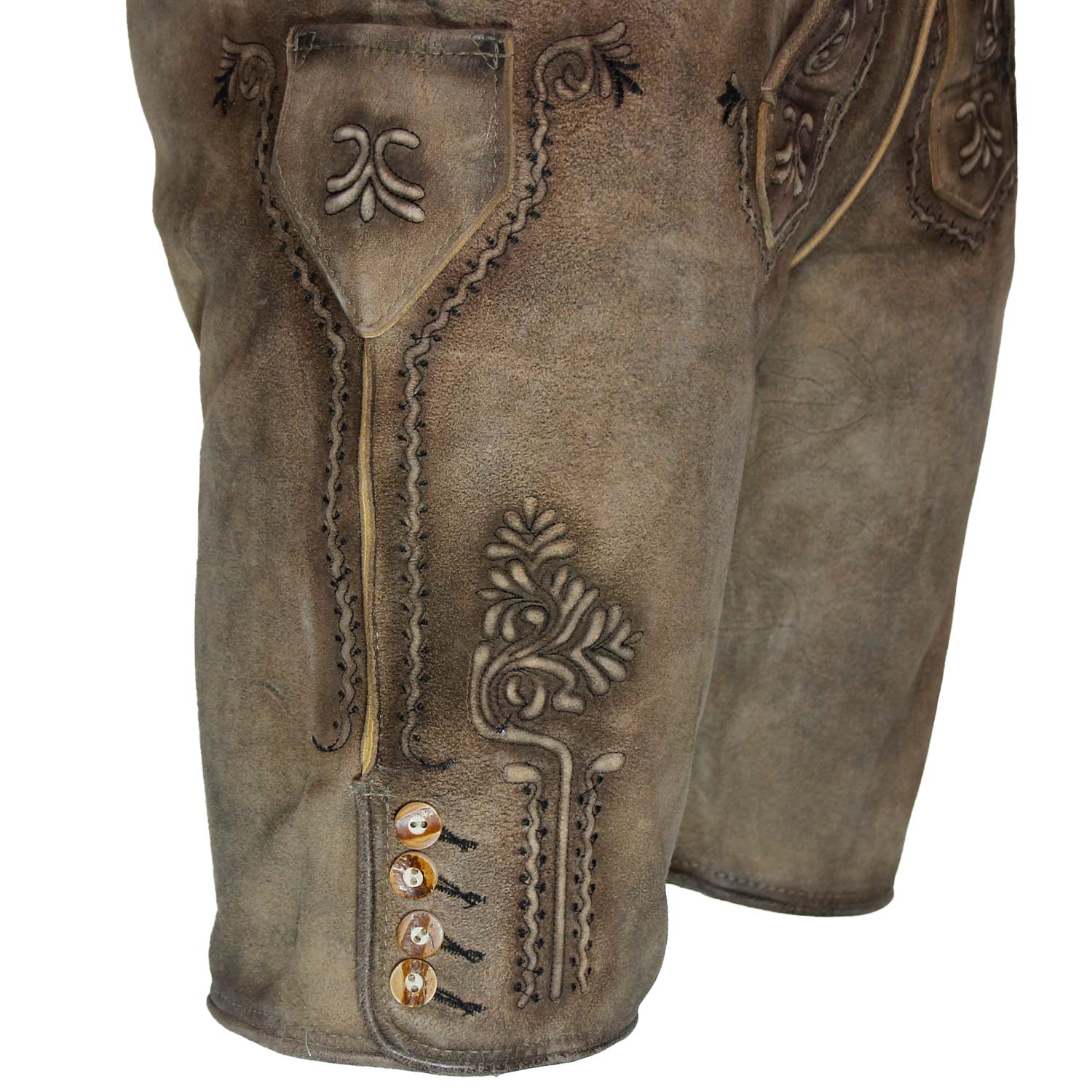 Besonders ins Auge stechen die aufwendigen Stickereien, die mit traditionellen Mustern verziert sind. Diese kunstvollen Ornamente, inspiriert von alpenländischer Handwerkskunst, ziehen sich entlang der Beine und rund um den Hosenlatz. Sie verleihen der Lederhose einen edlen, aber zugleich bodenständigen Look. Ein weiteres stilvolles Detail sind die Knöpfe aus echtem Horn an den Beinabschlüssen, die für eine authentische Note sorgen und die hochwertige Verarbeitung unterstreichen.