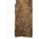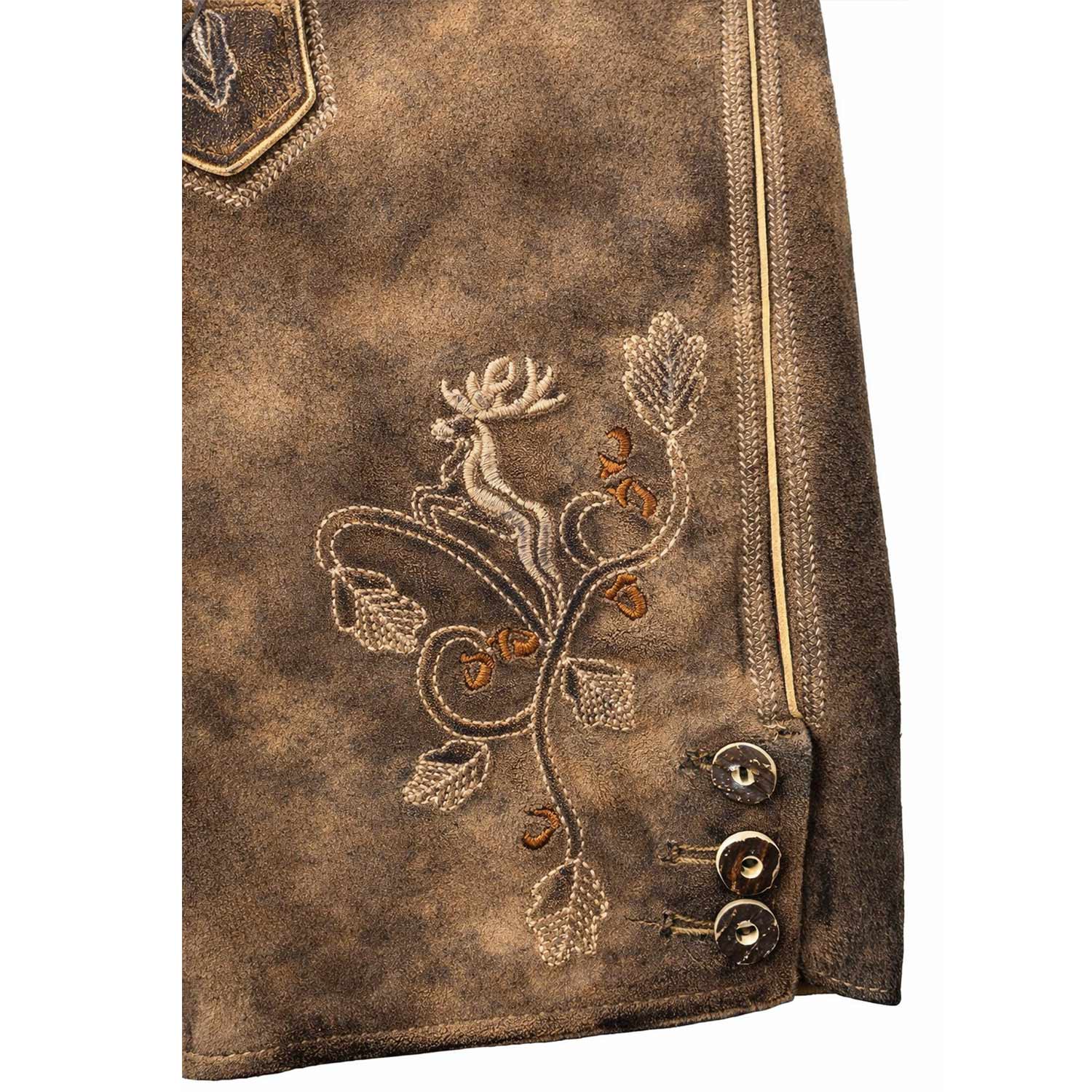 Ein besonderes Highlight sind die aufwendig gestickten Hirsch- und Rankmotive, die die Vorderseite der Lederhose zieren. Diese traditionellen Stickereien unterstreichen den authentischen Trachtenstil und verleihen der Hose eine hochwertige, detailreiche Ausstrahlung. Ergänzt wird das Design durch dekorative Knöpfe in Hornoptik sowie fein gearbeitete Ziernähte, die den klassischen Charakter der Lederhose perfekt abrunden.