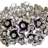 Das Armband ist mit vielen filigran gestalteten Blüten, welche mittig je mit einem kristallfarbenen Strassstein verziert sind, gestaltet. Durch die Farbgestaltung in Altsilber und klassisch glänzenden Steinen wirkt die Armkette sehr opulent und doch elegant. Das Armband passt sich durch zwei eingearbeitete Gummizüge Ihrem Handgelenk wunderbar an.