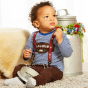Das fetzt! Der trachtige Langarmbody ist aus hochwertiger weicher, Baumwolle und mit grün weißem Ringel gestaltet. Die applizierten Stegträger mit Edelweiß, Hirschkopf und Lausbub Stickerei macht aus dem Unterziehbody ein tolles Trachtenaccessoire, was zum Drunterziehen fast zu schade ist.