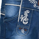 Die liebevollen Details wie die Trachtenknöpfe, der Latz und die Stickerei verleihen der Jeans eine besondere, charmante Note. Diese Details machen sie zu einem echten Hingucker, der sowohl den traditionellen Trachten-Look als auch einen modernen, stylischen Twist widerspiegelt. Die kontrastfarbigen Paspeln und der karierte Aufschlag runden das Design ab und sorgen für einen frischen, einzigartigen Style.
