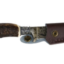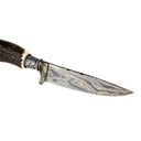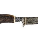Das Messer besitzt einen unverwüstlichen, echten Hirschhorngriff und eine extrem harte und robuste Messerklinge aus hochwertigem Damast. Die Messerklinge besteht aus 176 Lagen Damast und besitzt dadurch eine unübertroffene Schärfe, Schneidleistung und Schneidhaltigkeit, benötigt daher aber eine gewisse Pflege, da die Klinge nicht rostfrei ist. Neben der Messerklinge ist auch der Messergriff ein echter Blickfang und spiegelt hier die Einzigartigkeit der Natur wieder. Das Ende des Griffs ist mit einer versilberten Zierkappe, auf der ein flügelschlagender Adler aufgesetzt ist, veredelt. Um die Kappe und das Zwischenteil ist das Messer mit versilbertem Eichenlaub verziert. Neben dem schönen Trachten Messer wird noch eine Stilettscheide mitgeliefert. Diese ist antik versilbert und mit Beschlagteilen aus Messingfeinguß verziert.