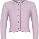 Die Strickjacke von Isar-Trachten ist ein entzückendes Kleidungsstück für Mädchen, perfekt für festliche Anlässe und Volksfeste wie das Oktoberfest. Sie ist hüftlang und kurz geschnitten, mit einem schönen Strickmuster und einer feinen Einfassung aus kleinen Mäusezähnchen am Rand, die wie eine farbige Paspel wirkt. Vorne ist sie mit silbernen Zierknöpfen versehen und kommt in einem bezaubernden Fliederfarbton, der sich ideal mit Kleidern und Röcken kombinieren lässt.