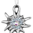 Ein schöner Edelweiß-Anhänger hängt an einem einreihigen, farbigen Band. Das Edelweiß ist mit Swarovski Strass besetzt und funkelt sehr schön.