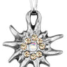 Ein schöner Edelweiß-Anhänger hängt an einem einreihigen, farbigen Band. Das Edelweiß ist mit Swarovski Strass besetzt und funkelt sehr schön.