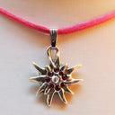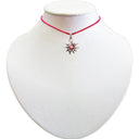 Ein schöner Edelweiß-Anhänger hängt an einem einreihigen, farbigen Band. Das Edelweiß ist mit Swarovski Strass besetzt und funkelt sehr schön.