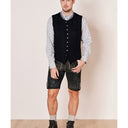 Diese schöne Herren Trachtenweste vom deutschen Hersteller Krüger ist ein echter Hingucker und ergänzt perfekt das Trachtenoutfit. Die Herrenweste hat einen eleganten Look, sie wird mit silbernen Zierknöpfen geschlossen und farblich abgesetzte Paspeln setzen zusätzlich Akzente. Die Frontseite der Lodenweste ist aus einem Wollmaterial hergestellt, im Rücken ist die Herrenweste aus einem glatten, schwarzen Stoff gefertigt und die Weite lässt sich über einen Querriegel im Rücken individuell anpassen. Diese Trachtenweste ist ein zeitlos-klassischer Begleiter fürs ganze Jahr. Wer moderne Tradition, Hochwertigkeit und Detailverliebtheit schätzt, für den dürfte diese Trachtenweste genau das Richtige sein.