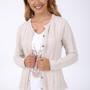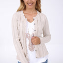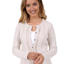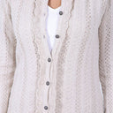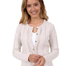 Die Damen Trachtenstrickjacke „Augusta“ vom Traditionshersteller Krüger Dirndl ist ein echtes Schmuckstück für stilvolle Trachten-Outfits. In einem edlen Naturton gehalten, kombiniert die Jacke klassische Elemente wie Zopfmuster und feine Lochstickerei mit einem modernen, figurbetonten Schnitt.