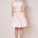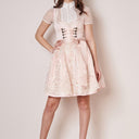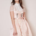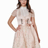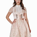 Das Dirndl Junia von Krüger MADL besticht durch eine frühlingshafte Farbgebung in zartem Rosé und ist durch die Perlenschürze ein echter Blickfang. Das Dirndl kommt hier in einer Mini-Länge mit 50cm Rocklänge. Das zartschimmernde Ornamentenmuster trifft auf eine atemberaubende Spitzenschürze mit Perlen. Ein Kleider-Traum in frischem Rosé aus dem Hause Krüger, der Sie mit einem romantischen Look und der tollen Verarbeitung und Qualität mit Sicherheit überzeugt. Der tiefe Herzausschnitt wird mit einer Rüsche und Borten besonders betont und Strass-besetzte Miederhaken zieren das Mieder. Geschlossen wird das Damendirndl vorn mit einem Reißverschluss, der von der Schnürung gekonnt verdeckt wird. Die wunderschöne Schürze mit floralem Muster rundet das Gesamtbild perfekt ab.