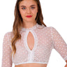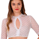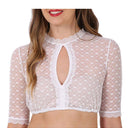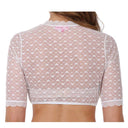 Extravagante, exklusive Dirndlbluse für Damen von Krüger Dirndl. Die hinreißende, transparente Dirndlbluse Kiana bezaubert durch ein zartes Herzchen-Muster und einen tollen Tropfenausschnitt, der das Dekolleté besonders schön betont. Die außergewöhnliche Damenbluse hat halblange Ärmel, die Abschlüsse sind mit zarten Spitzenborten besetzt und das interessante Spitzenmuster passt perfekt als Ergänzung zu romantischen Miedern und Dirndln.