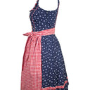 Das schöne Dirndlkleid besteht aus einem blauen Baumwollstoff, welcher mit vielen kleinen weißen Blumen bedruckt ist und einer Rot Weiß karierten Schürze. Süße Froschmaulrüschen im Muster des Kleides zieren den Ausschnitt und betonen somit das Dekolleté. Das Minidirndl wird an der linken Seite unterhalb des Armes durch einen Reißverschluss geschlossen. Zum Betonen des Dekolleté kann vorne noch ein rotes Satinband geschnürt werden. Dieses wird durch Ösen in Blumenform mit Strass Elementen gehalten.