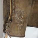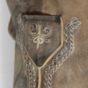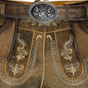 Der Hosenlatz wird vorn durch passende Knöpfe geschlossen und die Bundweite kann hinten durch ein Lederband reguliert werden. Neben den zwei Eingriffstaschen und der Tasche auf der Rückseite besitzt diese Lederhose auch noch eine kleine bestickte Tasche am rechten Hosenbein. Diese braune Lederhose besticht durch die raffinierte Verbindung von eleganten und derb-rustikalen Lederapplikationen.