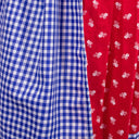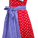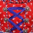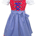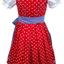 Ein modernes und zugleich traditionell gestaltetes Dirndl aus dem Hause Country Maddox - Marke Alpenfeeling - für Mädchen. Das bezaubernde Dirndlkleid ist aus einem roten Baumwollstoff hergestellt, der mit einem hübschen Blümchenmuster verziert ist. Eine blau-weiß karierte Schürze ergänzt dieses Dirndl perfekt. Niedliche silberne Zierknöpfe in Form einer Blume mit Strass Elementen halten die Schnürung mit einem blauen Band. Den hübschen Ausschnitt ziert eine entzückende Froschmaulrüsche aus Kleid- und Schürzenstoff. Blau-weiße Biesen im Oberteil runden das Bild ab und machen das Dirndl zu etwas ganz Besonderem. Das Kleid wird im Rücken mit einem Reißverschluss geschlossen, was das An- und Ausziehen erleichtert. Die hübsche, weiße Bluse ist angenehm zu tragen und der Ausschnitt und die Ärmel sind mit Bordürenband eingefasst.