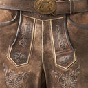 Die braune Kniebundlederhose vom deutschen Hersteller MADDOX ist aus weichem Ziegenveloursleder in bewährter Qualität hergestellt. Der handmade Stoned Effekt des Leders macht jedes Teil zu einem Unikat. Neben der auffälligen Stickerei seitlich am Bein und am Hosenlatz rundet der farblich passende Gürtel mit altgoldener Schnalle und Bayernwappen die Lederhose perfekt ab. Der Hosenlatz wird vorne durch Knöpfe in Hirschhorn Optik geschlossen und die Bundweite kann hinten durch ein Lederband reguliert werden.