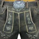 Typische Trachtenstickereien zieren den Hosenlatz sowie die seitlichen Beinpartien und verleihen der Hose eine stilvolle, traditionelle Note. Besonders auffällig sind die Knöpfe in Hirschhorn-Optik, die den Hosenlatz sicher verschließen und den authentischen Look unterstreichen. Die Bundweite lässt sich mit einem Lederband auf der Rückseite individuell anpassen, um eine optimale Passform zu gewährleisten.
