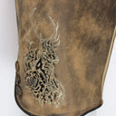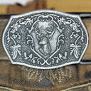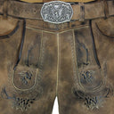 Dank des mitgelieferten Gürtels mit einer aufwendig gestalteten Metallschnalle lässt sich die Hose individuell anpassen. Das Motiv auf der Schnalle ist detailreich gearbeitet und passt perfekt zum rustikalen Design der Lederhose Brienz. Zusätzlich verfügt das Modell über praktische Eingrifftaschen, die ausreichend Platz für kleine Utensilien bieten.