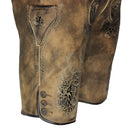 Besondere Aufmerksamkeit verdienen die kunstvollen Stickereien, die die Lederhose zu einem echten Schmuckstück machen. Die detailreichen Hirschmotive auf beiden Beinen sind kunstvoll eingearbeitet und unterstreichen die traditionsbewusste Eleganz des Modells. Ergänzt werden sie durch florale Verzierungen, die dem Design eine edle und harmonische Note verleihen. Die hellen Stickereien setzen sich kontrastreich vom dunklen Leder ab und sorgen für eine ansprechende Optik.