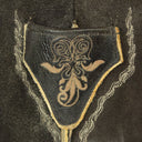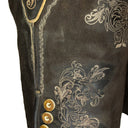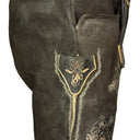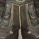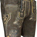 Diese kurze Lederhose aus Echtleder ist besonders hochwertig verarbeitet und dadurch weich im Griff. Sie wird mit einem tollen Ledergürtel mit Hirsch Zierschnalle geliefert und liegt voll im Trend. Neben der wunderschönen Ranken Stickerei seitlich am Bein und am Hosenlatz runden Knöpfe in Hirschhorn Optik die Lederhose perfekt ab. Der Hosenlatz wird vorn durch passende Knöpfe geschlossen und die Bundweite kann hinten durch ein Lederband reguliert werden. Neben den zwei Eingrifftaschen besitzt diese Lederhose auch noch eine kleine bestickte Tasche am rechten Hosenbein. Diese Lederhose besticht durch die raffinierte Verbindung von eleganten und derb-rustikalen Lederapplikationen.