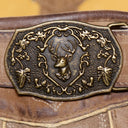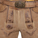 Ein weiteres Highlight ist der robuste Ledergürtel mit einer dekorativen Metallschnalle, die mit einem kunstvollen Wappenmotiv verziert ist. Dieses stilvolle Accessoire rundet den rustikalen Look perfekt ab und macht die Lederhose zu einem echten Hingucker auf jeder Wiesn oder Kirchweih. Die Kombination aus dunklen Schattierungen und dem aufwendig gealterten Leder verleiht der Hose einen einzigartigen Vintage-Look, der sich ideal mit einem klassischen Trachtenhemd und Haferlschuhen kombinieren lässt.