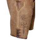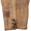 Der praktische Hosenlatz wird mit klassischen Knöpfen im Hirschhorn-Look geschlossen, während die Bundweite durch ein Lederband am Rücken individuell angepasst werden kann. Dies sorgt für eine perfekte Passform und optimalen Sitz. Die Lederhose verfügt über zwei seitliche Eingriffstaschen, eine Gesäßtasche sowie eine kleine, bestickte Messertasche am rechten Bein – ideal für traditionelle Accessoires oder praktische Utensilien.