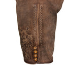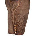 Die detailreichen Stickereien entlang des Hosenlatzes und seitlich am Bein verleihen der Hose eine edle, traditionelle Note. Besondere Akzente setzen die dekorativen Knöpfe in Hirschhorn-Optik, die sowohl den Hosenlatz als auch die Beinabschlüsse zieren. Der vordere Hosenlatz wird mit klassischen Knöpfen verschlossen, während die Bundweite durch ein Lederband auf der Rückseite individuell angepasst werden kann, um eine perfekte Passform zu gewährleisten.