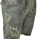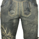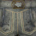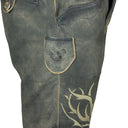 Diese kurze grau Lederhose aus Echtleder ist besonders hochwertig verarbeitet und dadurch weich im Griff. Sie wird mit einem tollen Ledergürtel mit Zierschnalle geliefert und liegt voll im Trend. Neben auffälligen Stickereien machen die Stickerei in Form eines großen Hirschkopfes am einen Bein und Schriftzügen am anderen Bein diese Lederhose zu etwas ganz Besonderen. Der Hosenlatz wird vorn durch Knöpfe geschlossen und die Bundweite kann hinten durch ein Lederband reguliert werden. Neben den zwei Eingrifftaschen und der Tasche auf der Rückseite besitzt diese Lederhose auch noch eine kleine bestickte Tasche am rechten Hosenbein.