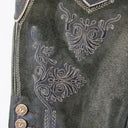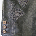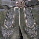 Diese kurze Lederhose aus Echtleder ist besonders hochwertig verarbeitet und dadurch weich im Griff. Sie wird mit einem tollen Ledergürtel mit Zierschnalle geliefert und liegt voll im Trend. Neben der auffälligen Stickerei seitlich am Bein und am Hosenlatz runden Knöpfe in Hirschhorn Optik die Lederhose perfekt ab. Der Hosenlatz wird vorn durch passende Knöpfe geschlossen und die Bundweite kann hinten durch ein Lederband reguliert werden. Neben den zwei Eingrifftaschen und der Tasche auf der Rückseite besitzt diese Lederhose auch noch eine kleine bestickte Tasche am rechten Hosenbein. Diese dunkle Lederhose besticht durch die raffinierte Verbindung von eleganten und derb-rustikalen Lederapplikationen.