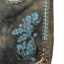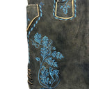 Der Hosenlatz wird vorn durch passende Knöpfe geschlossen und die Bundweite kann hinten durch ein Lederband reguliert werden. Neben den zwei Eingriffstaschen und der Tasche auf der Rückseite besitzt diese Lederhose auch noch eine kleine bestickte Tasche am rechten Hosenbein. Diese graue Lederhose besticht durch die raffinierte Verbindung von eleganten und derb-rustikalen Lederapplikationen.