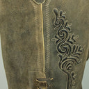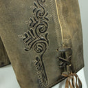 Diese kurze Lederhose aus Echtleder ist besonders hochwertig verarbeitet und dadurch weich im Griff. Sie wird mit einem tollen Ledergürtel mit Zierschnalle geliefert und liegt voll im Trend. Neben der auffälligen Stickerei seitlich am Bein und am Hosenlatz rundet der Gürtel mit Bayern Wappen die Lederhose perfekt ab. Der Hosenlatz wird vorn durch passende Knöpfe geschlossen und die Bundweite kann hinten durch ein Lederband reguliert werden. Neben den zwei Eingrifftaschen und der Tasche auf der Rückseite besitzt diese Lederhose auch noch eine kleine bestickte Tasche am rechten Hosenbein. Diese braune Lederhose besticht durch die raffinierte Verbindung von eleganten und derb-rustikalen Lederapplikationen.