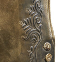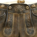 Die braune kurze Lederhose aus Ziegenleder ist besonders hochwertig verarbeitet und dadurch weich im Griff. Schöne Stickerei seitlich am Bein, am Hosenlatz und am Brustteil des H-Trägers machen diese Hose zu einem echten Hingucker. Der Hosenlatz wird vorne durch Knöpfe in Hirschhorn Optik geschlossen, auch die Träger sind mit Knöpfen befestigt. Die Hosenbeine sind mit je drei dekorativen Knöpfen verziert. Die Bundweite kann hinten durch ein Lederband reguliert werden. Die Lederhose hat vorne zwei Hosentaschen und ist zusätzlich noch mit einer Hosentasche hinten und einer kleinen Seitentasche versehen. Die abnehmbaren Stegträger sind variabel einstellbar und machen diese Hose zu einem zünftigen Begleiter für jeden Trachtenliebhaber.