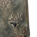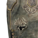 Der Hosenlatz wird vorn durch passende Knöpfe geschlossen und die Bundweite kann hinten durch ein Lederband reguliert werden. Neben den zwei Eingriffstaschen und der Tasche auf der Rückseite besitzt diese Lederhose auch noch eine kleine bestickte Tasche am rechten Hosenbein. Diese braune Lederhose besticht durch die raffinierte Verbindung von eleganten und derb-rustikalen Lederapplikationen.