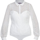Betörender Blusenbody vom deutschen Hersteller MarJo aus traumhafter Spitze in Offwhite. Der Body begeistert mit zarten Einblicken, Herzausschnitt, edlem Stehkragen und langen Spitzenärmeln. Der romantische Blusenbody Harper-Malinda für Damen ist vielseitig einsetzbar, die eng-anliegende Form betont perfekt Ihre Figur. Bis zum schönen Herzausschnitt ist der Body blickdicht gefüttert. als Futter dient ein angenehmes Shirtmaterial, das Höschenteil aus stretchigem Jersey verfügt im Schritt über einen Druckknopfverschluss.
