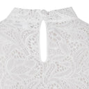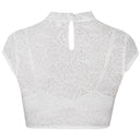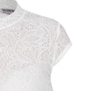 Die Bluse ist aus feiner, floraler Spitze gefertigt, die nicht nur optisch ein Highlight ist, sondern auch besonders angenehm auf der Haut liegt. Dank der kurzen Ärmel und des kleinen Stehkragens bietet sie einen edlen Look, der sich sowohl klassisch als auch modisch interpretieren lässt. Der Ausschnitt am Rücken mit kleinem Knopfverschluss sorgt für ein einfaches An- und Ausziehen und setzt gleichzeitig einen dezenten Akzent.