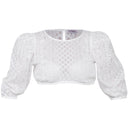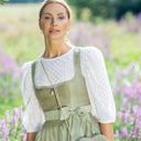 Die leichten Puffärmelchen in schmeichelhafter Dreiviertellänge sorgen für eine feminine Silhouette und bieten gleichzeitig hohen Tragekomfort. Die Bluse wird im Nacken mit einem kleinen Knopf geschlossen – ein liebevolles Detail, das gleichzeitig praktisch ist. Der Schnitt ist körpernah und passt sich dem Dirndl perfekt an, ohne aufzutragen.