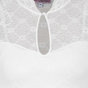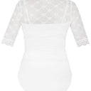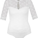 Der Schulterbereich sowie die Halbarme sind aus feinster, transparenter Spitze gearbeitet und verleihen dem Body eine zarte, romantische Note. Die filigrane Spitze bringt Leichtigkeit ins Design und sorgt gleichzeitig für eine elegante Silhouette. Im unteren Bereich ist die Spitze blickdicht unterlegt, sodass der Body angenehm und sicher getragen werden kann – ideal auch für festliche Anlässe.