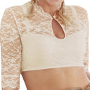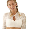 Die Dirndlbluse Alicia präsentiert sich in einem halbtransparentem Look, feinste Spitze verziert das Oberteil, das Brustteil und der untere Rücken sind mit blickdichtem, weichem Stoff unterlegt. Ein raffinierter Loch-Ausschnitt in Tropfenform betont das Dekolleté und der eingearbeitete Gummizug am Blusenabschluss verleiht der Trachtenbluse einen perfekten Sitz und eine gute Passform. Die Bogenspitze am Armabschluss und Kragen rundet das Gesamtbild perfekt ab.