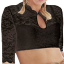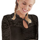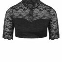 Die Dirndlbluse Alicia präsentiert sich in einem halbtransparentem Look, feinste Spitze verziert das Oberteil, das Brustteil und der untere Rücken sind mit blickdichtem, weichem Stoff unterlegt. Ein raffinierter Loch-Ausschnitt in Tropfenform betont das Dekolleté und der eingearbeitete Gummizug am Blusenabschluss verleiht der Trachtenbluse einen perfekten Sitz und eine gute Passform. Die Bogenspitze am Armabschluss und Kragen rundet das Gesamtbild perfekt ab.