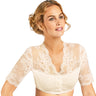 Die Dirndlbluse Kalea präsentiert sich in einem halbtransparenten Look - feinste Spitze verziert das Oberteil. Das Brustteil und der untere Rücken sind mit blickdichtem, weichem Stoff unterlegt. Durch den geschwungenen Ausschnitt wird das Dekolleté dezent betont und der eingearbeitete Gummizug am Blusenabschluss verleiht der Trachtenbluse einen perfekten Sitz und eine gute Passform. Die Bogenspitze am Armabschluss und Kragen rundet das Gesamtbild perfekt ab. Geschlossen wird die Damenbluse mit drei Kugelknöpfen und einem normalen Knopf in Perlmutt.